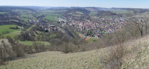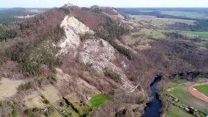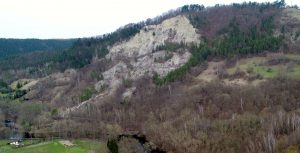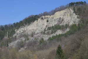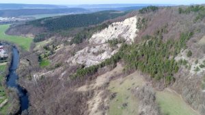 If one follows the picturesque Saale valley between Rudolstadt and Jena, it is impossible to miss the Dohlenstein (Dohle = jackdaw; rock of the jackdaws). Located on the right bank of the Saale River opposite the town of Kahla, the mountain stands 200 meters above the valley. Instead of the otherwise prevailing, rather gentle hills, one sees a bright white vertical rock face at the uppermost part of the mountain. The almost horizontal sediment layers stand out against the dark forest cover. Below, there impressive masses of debris and it becomes immediately clear that this is a huge landslide. With the Leuchtenburg castle towering above the Dohlenstein, this is one of the most spectacular sights that the middle Saale Valley has to offer. But not only the landslide itself is remarkable, also the geological context is highly interesting.
