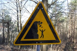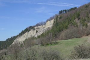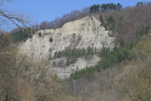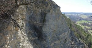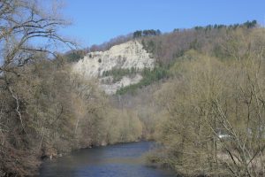 The Dohlenstein is a huge landslide in the Saale valley, which is active since at least 1740. The largest landslides have even changed the course of the Saale river. Here, rocks of the Muschelkalk overlie Buntsandstein units (Triassic). The uppermost layers of the Buntsandstein consist of mudstones. There, water accumulates in the rock and a sliding surface is formed. On this sliding surface the overlying rocks move towards the valley and form a large debris cone. The landslide cliff can be seen from afar as a bright white, vertical rock face.